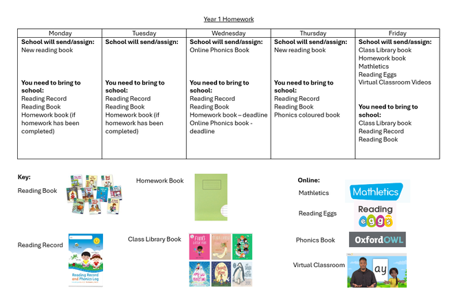Homework books: One piece of Maths homework. One piece of handwriting/letter formation homework. |